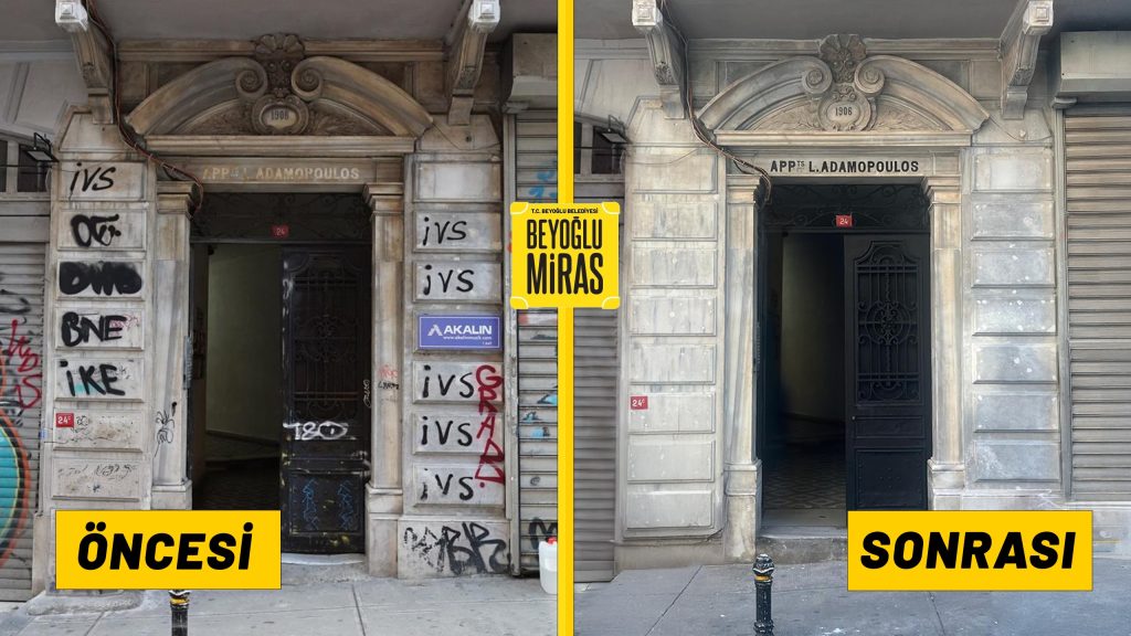 Beyoğlu’muzdaki kültür varlıklarını koruma altına alarak geleceğe taşıyor Pera’nın eşsiz mirasını yaşatmak için çalışıyoruz. Leonidas Adamopoulos Apartmanı’nın giriş cephesi, zaman